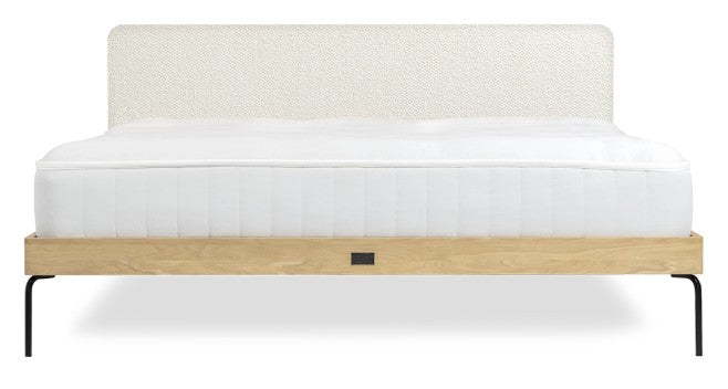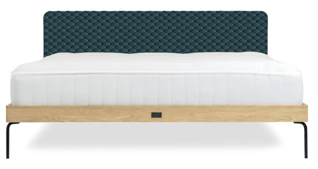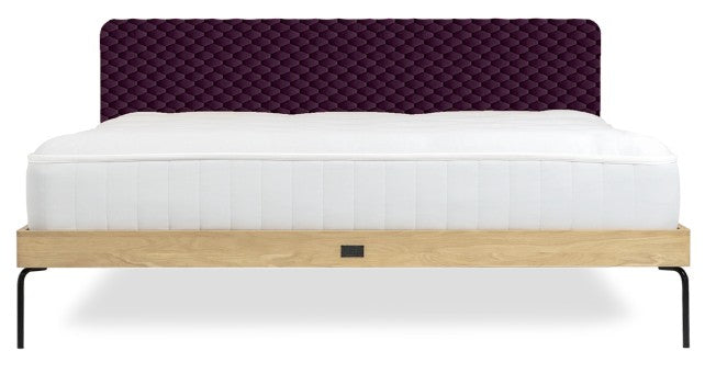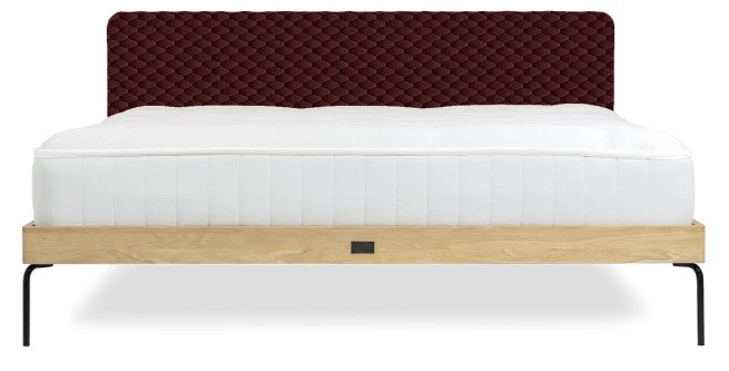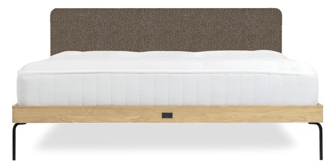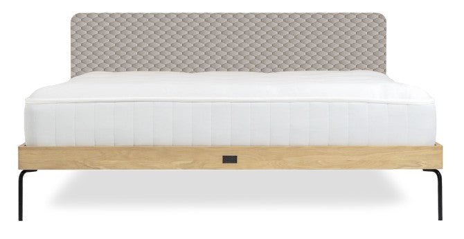 Bed Ehe with original slim & curved black legs. Stunningly beautiful bed with exquisite airiness and refined design. The strength and longevity are achieved by using solid oak wood and steel.